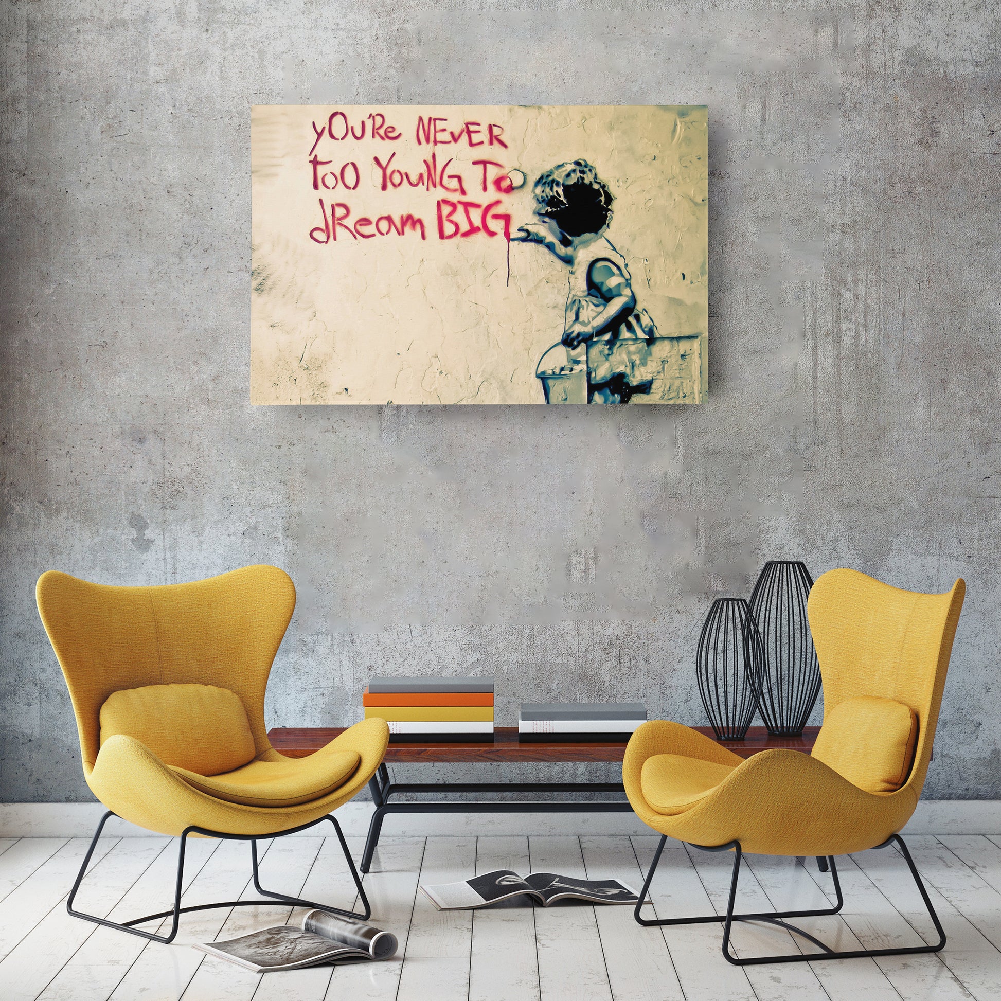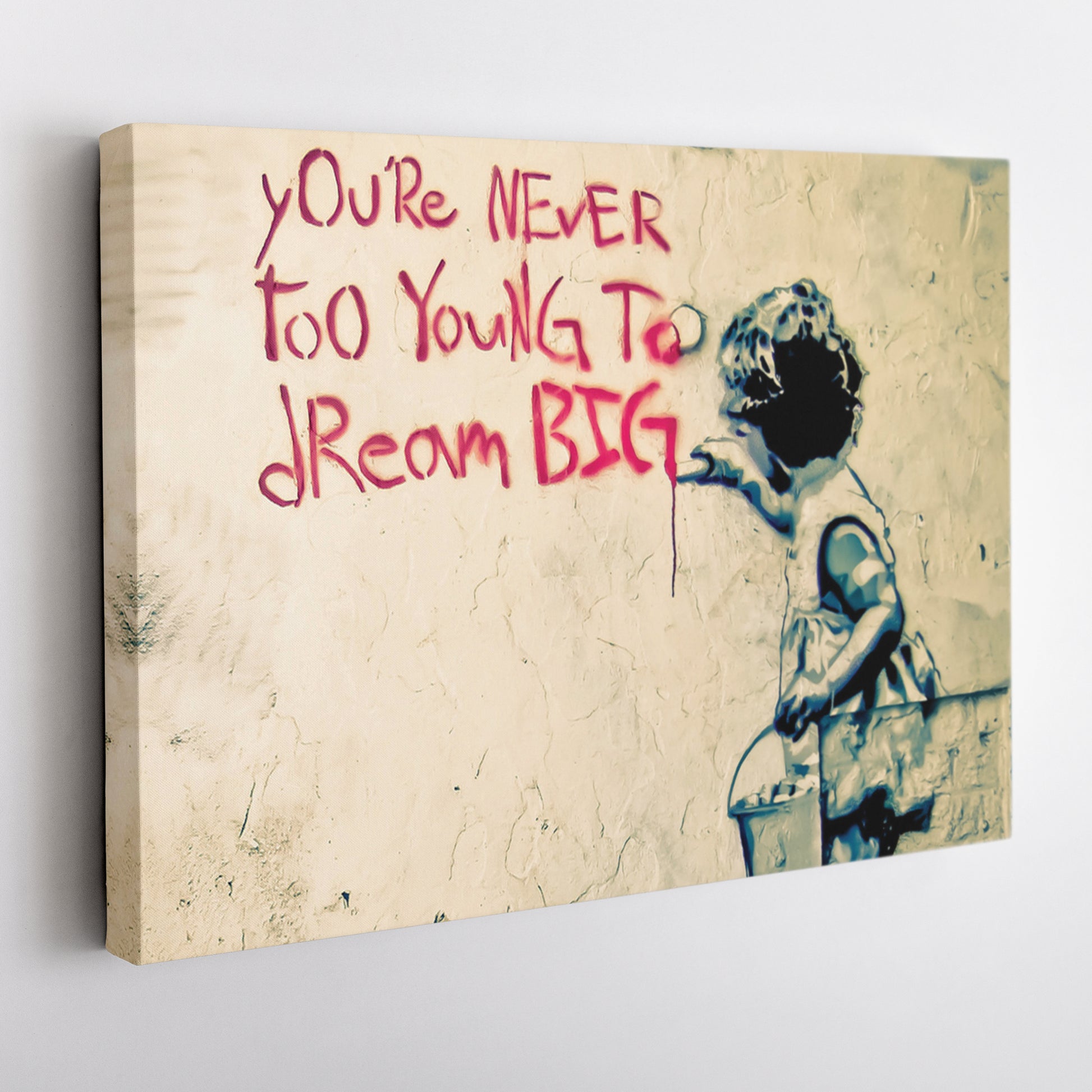 Bring a spark of urban encouragement and youthful ambition into your space with this Banksy 'You Are Never Too Young to Dream Big' Canvas Print. Shop now and dream louder.
