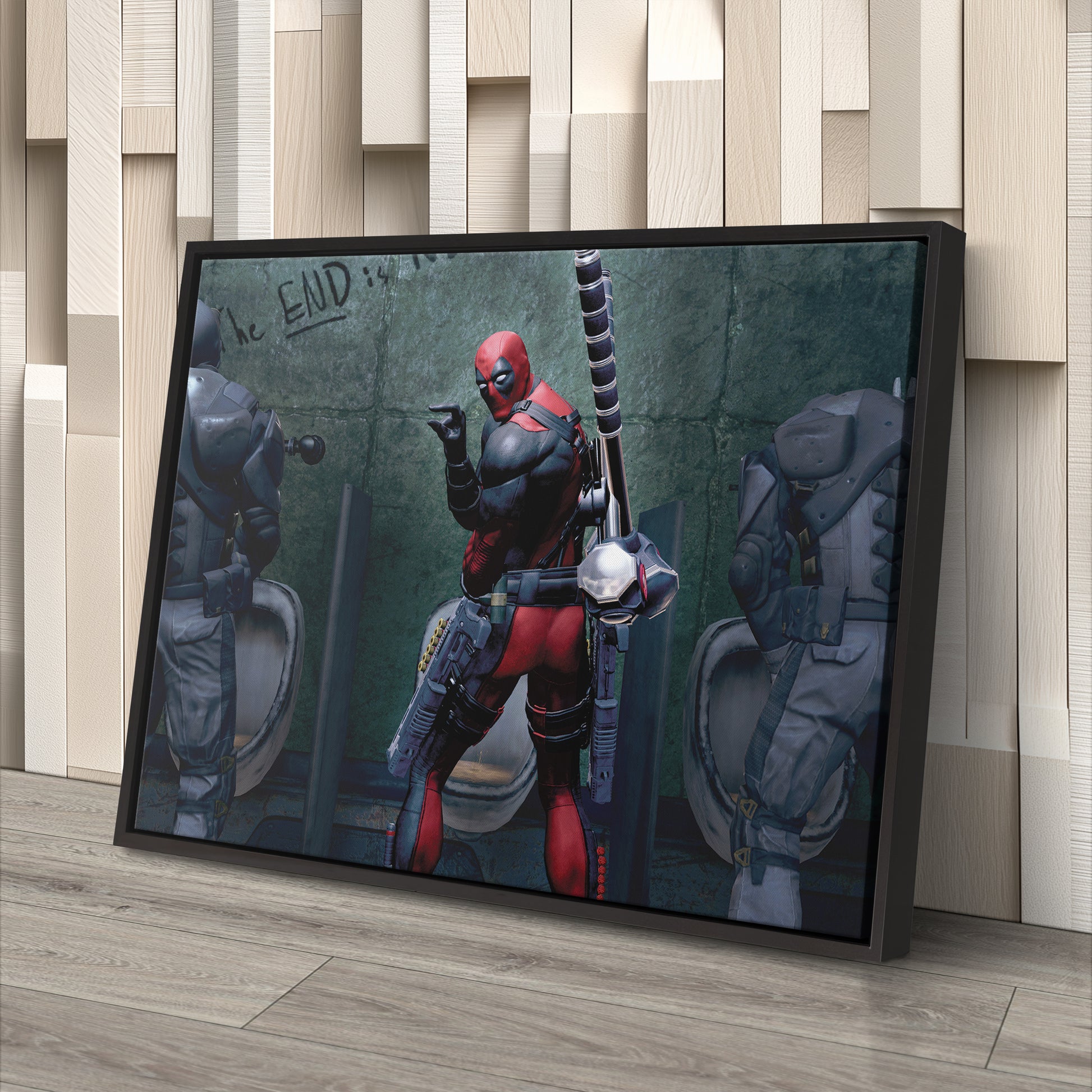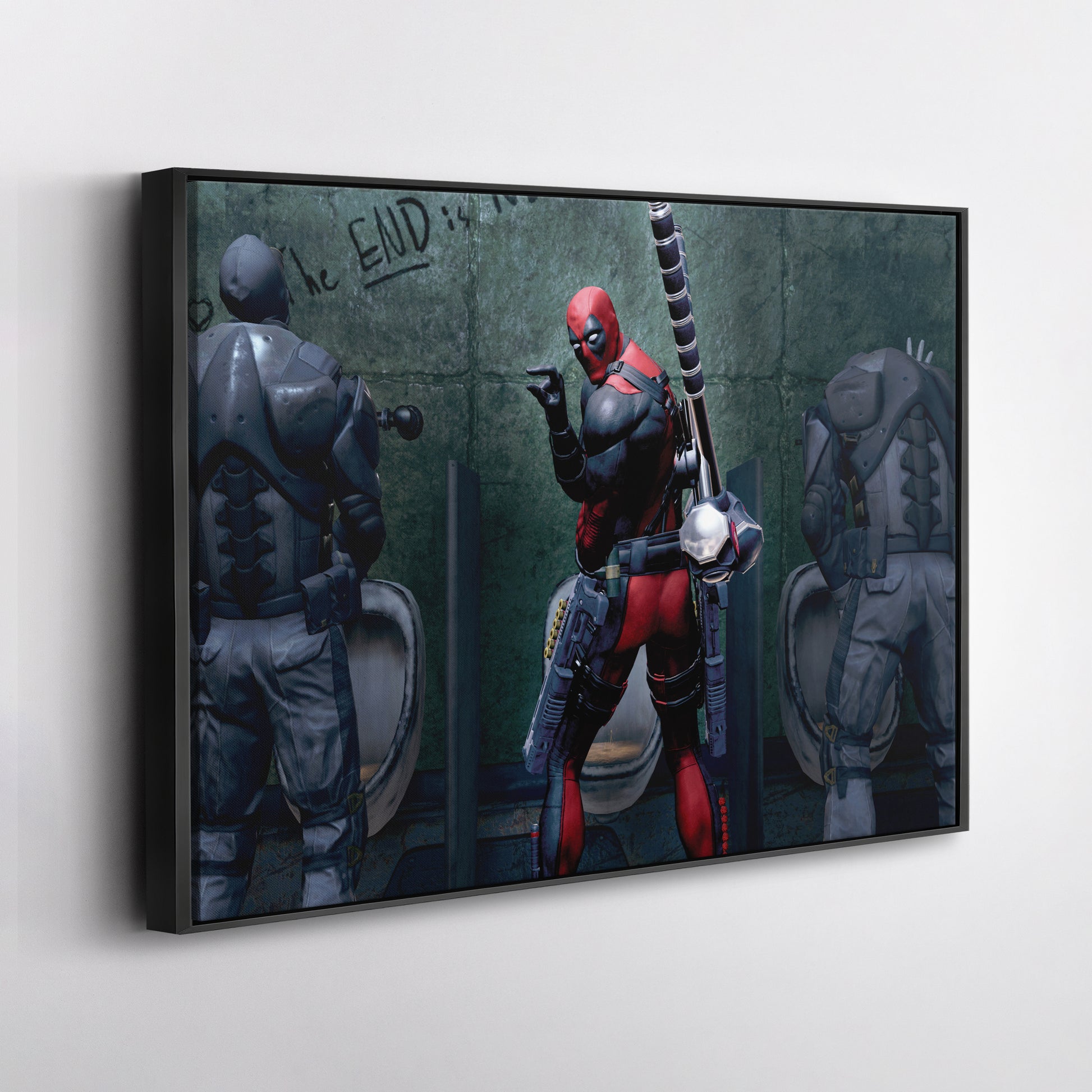 Add chaotic comedy to your space with this Deadpool Bathroom Break Canvas Print. Shop now and make your walls as wild as Wade Wilson himself.