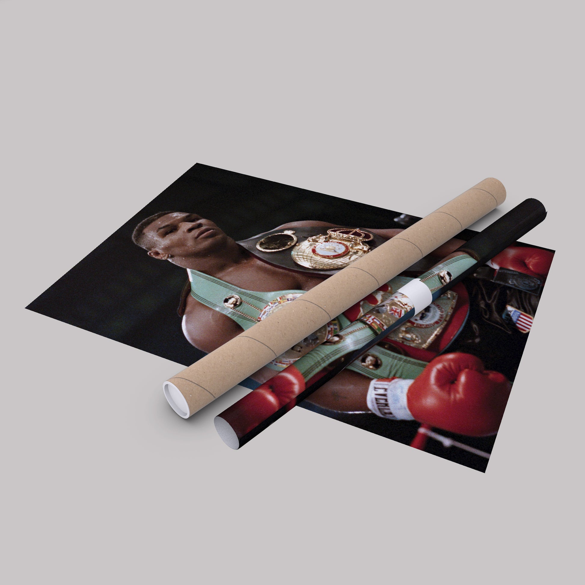 - Champion Tribute: Showcases Mike Tyson holding his belts, symbolizing his boxing dominance.
