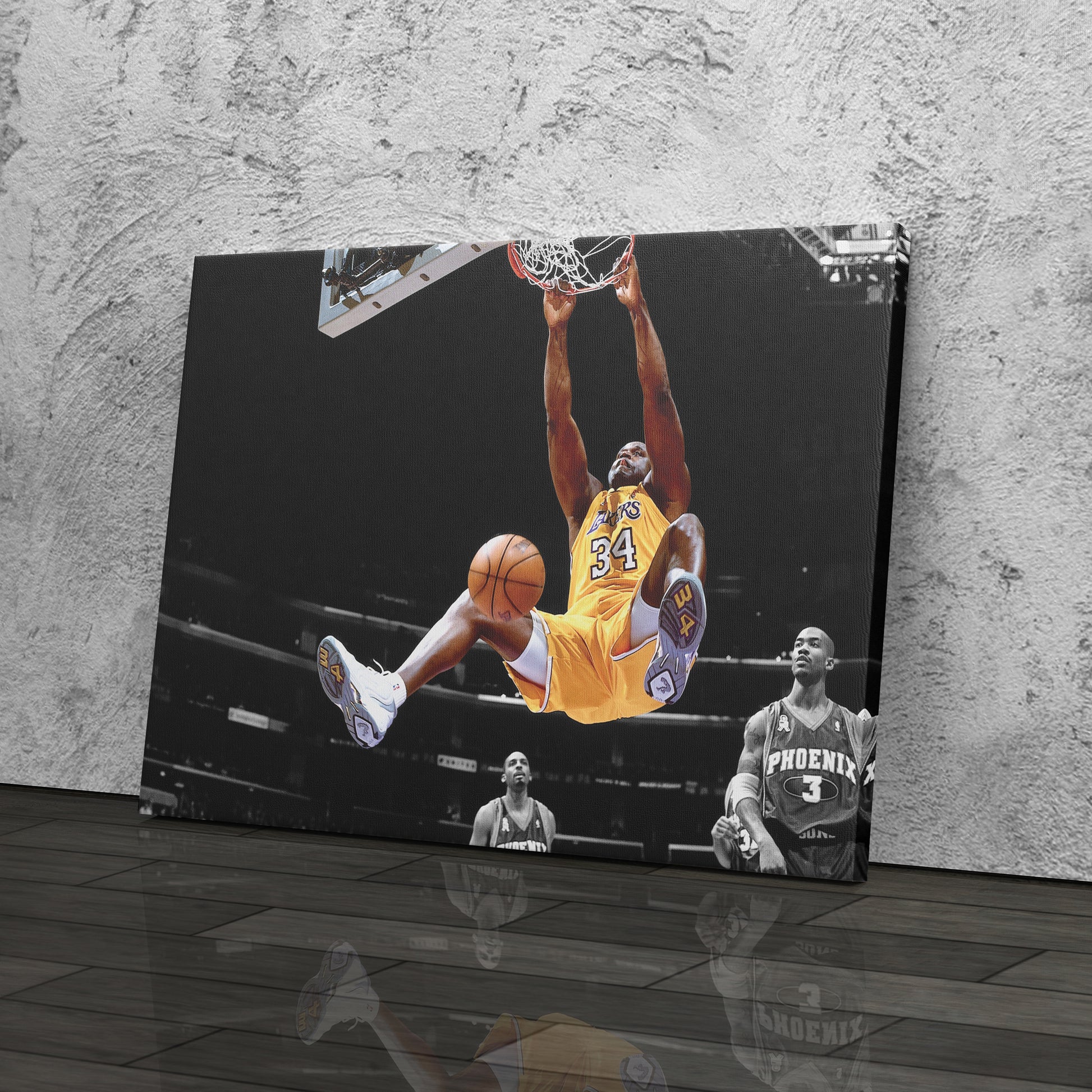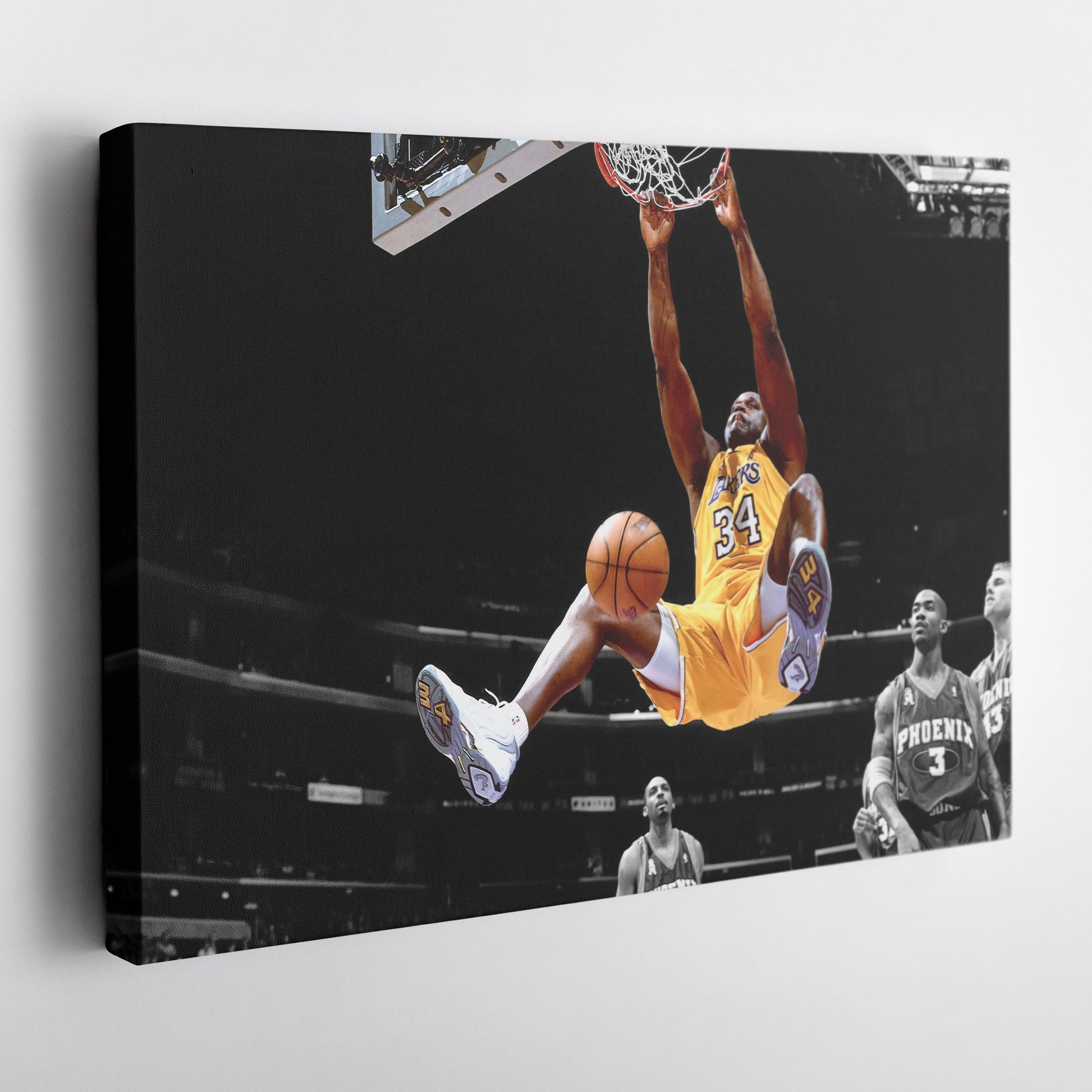 Bring the dominance of Shaq Diesel into your space with this Shaquille O'Neal Dunking Canvas Art. Shop now to own a piece of NBA greatness!