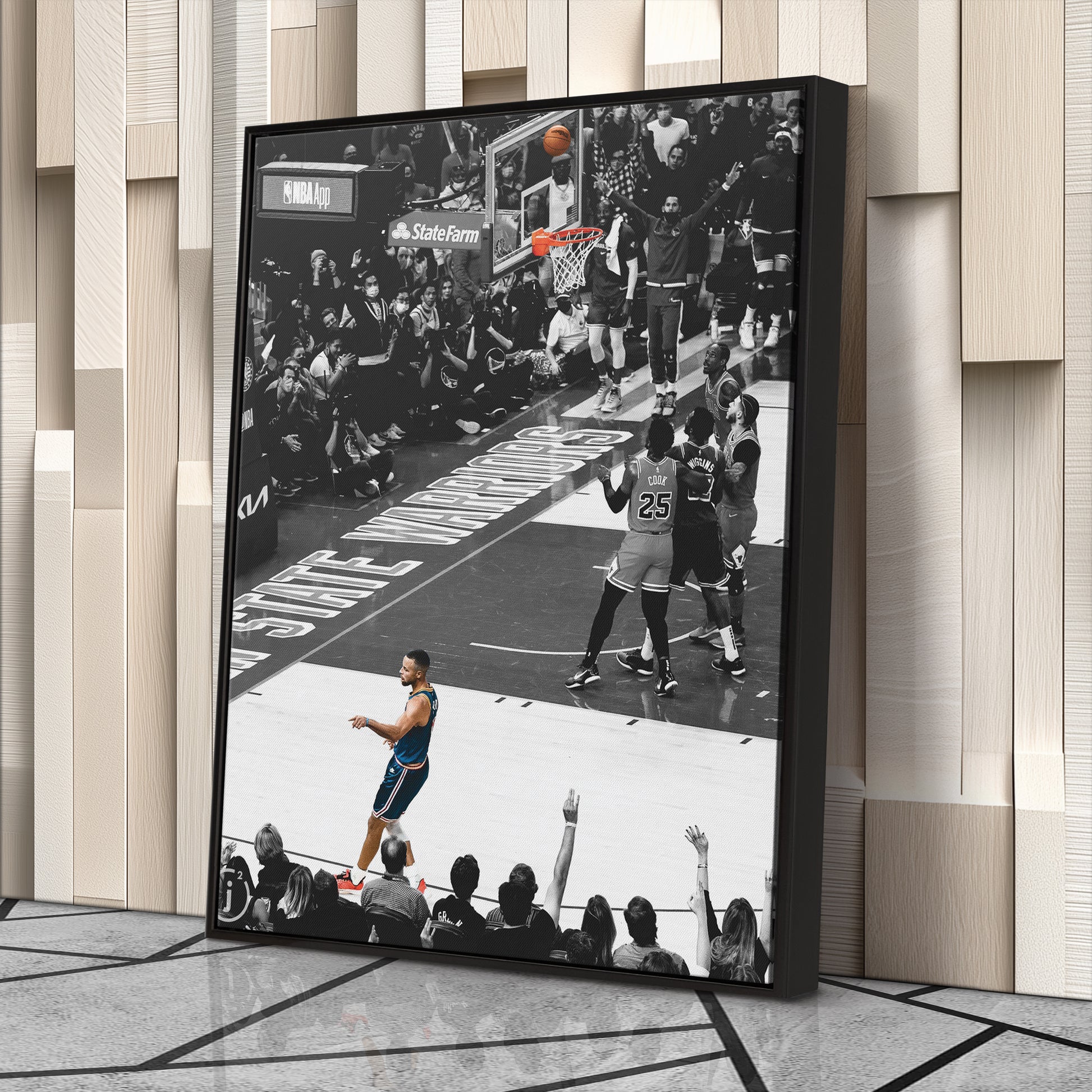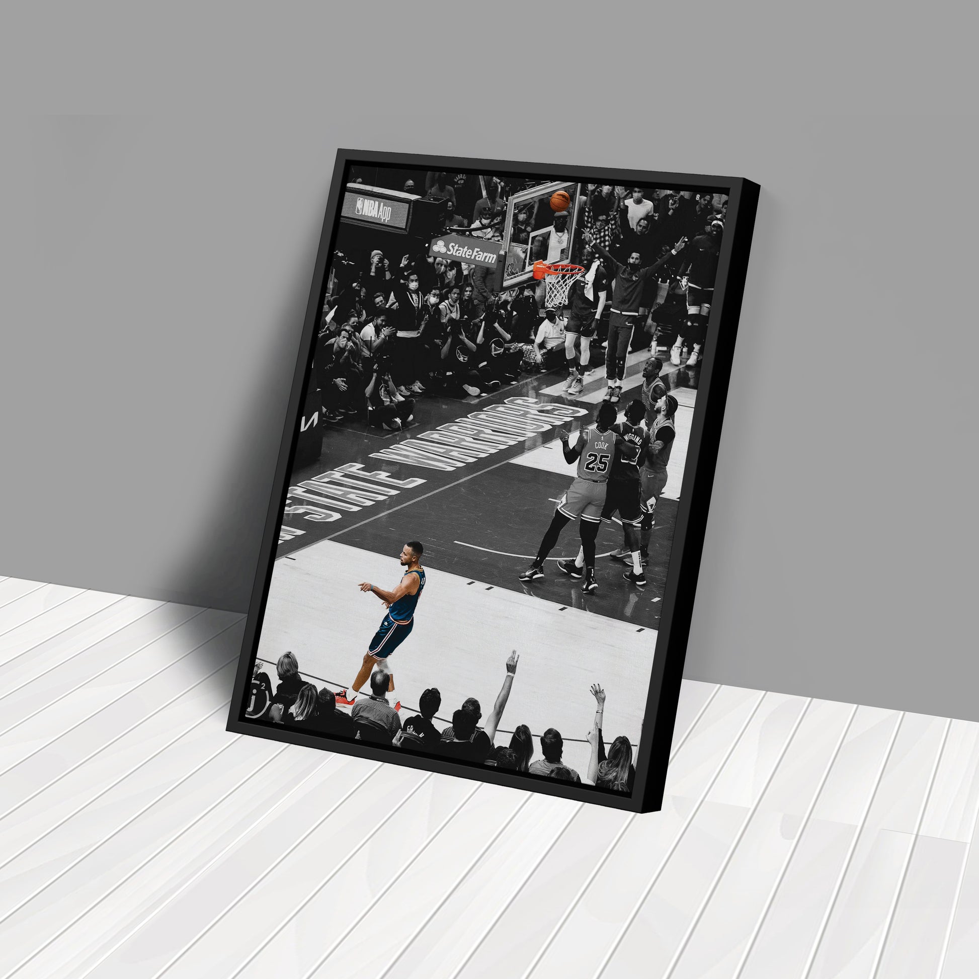 - Iconic NBA Moment: Captures Stephen Curry’s legendary no-look shot celebration.