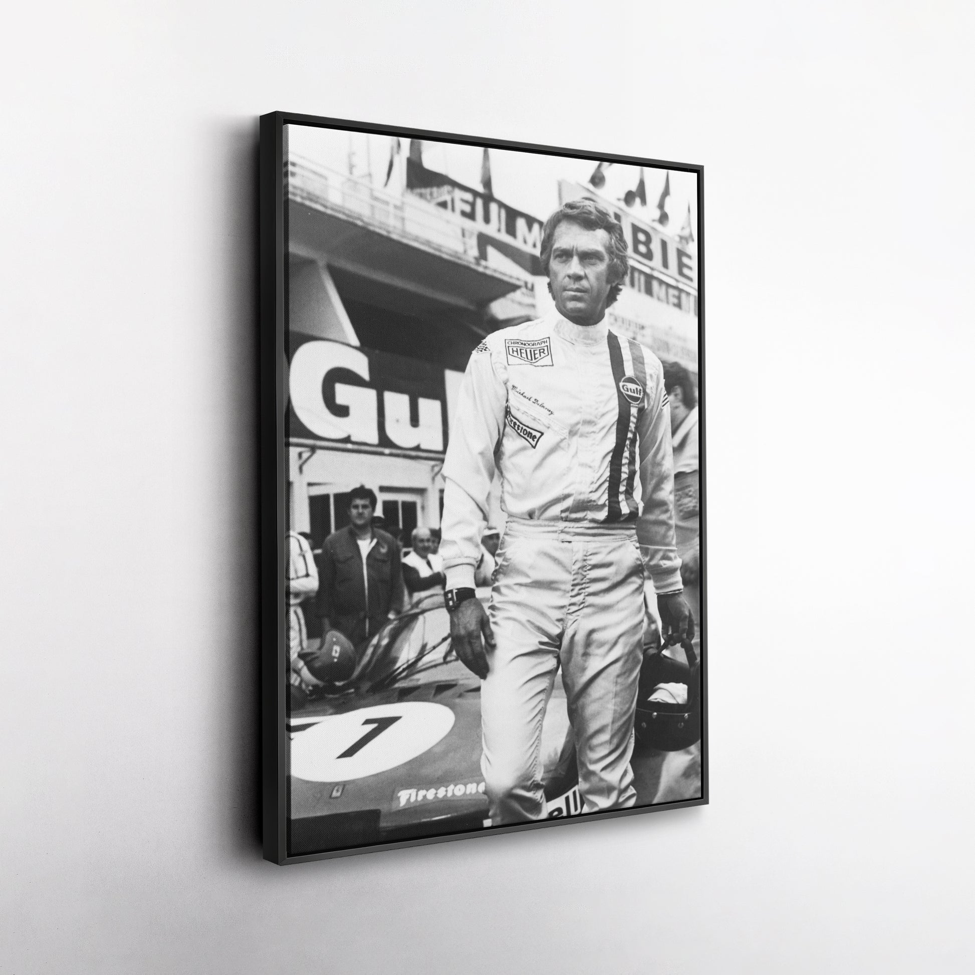 - Racing & Hollywood Icon: Showcases Steve McQueen in his iconic Le Mans 1971 racing attire.